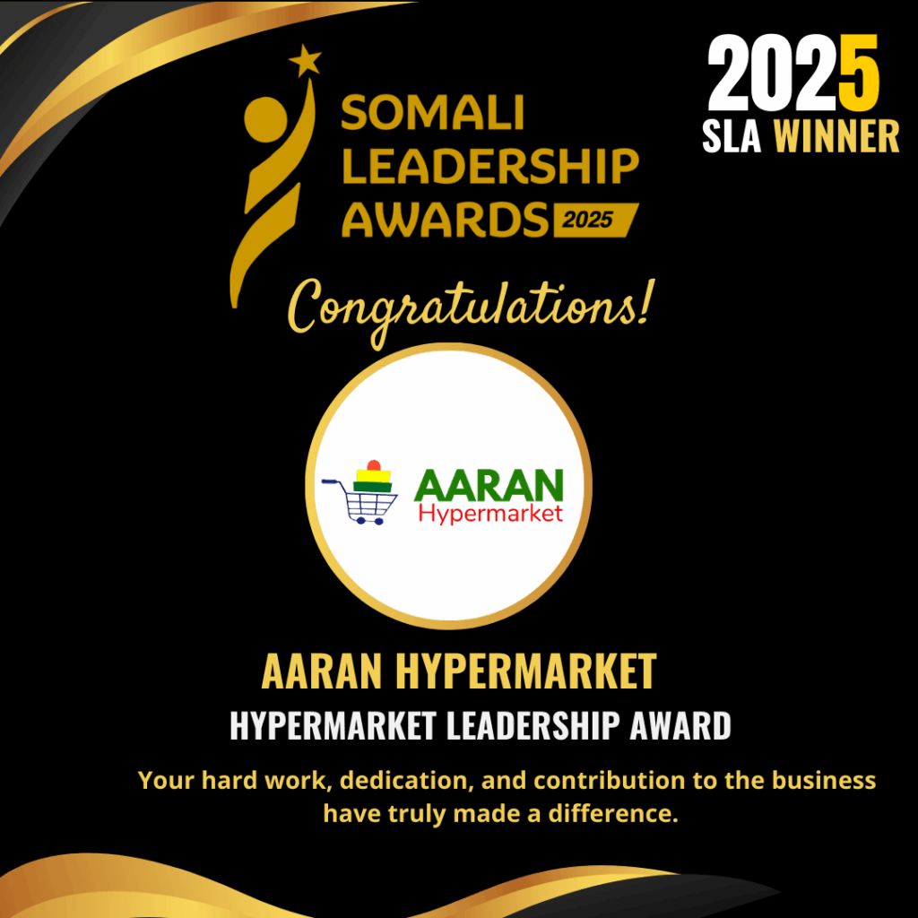 The Somali Leadership Awards aim to honor individuals and organizations that are dedicated to making a positive difference in Somalia. Aaran Hypermarket’s recognition underscores the vital role of retail leadership in driving economic growth and enhancing the quality of life for Somalis.