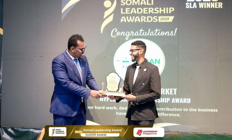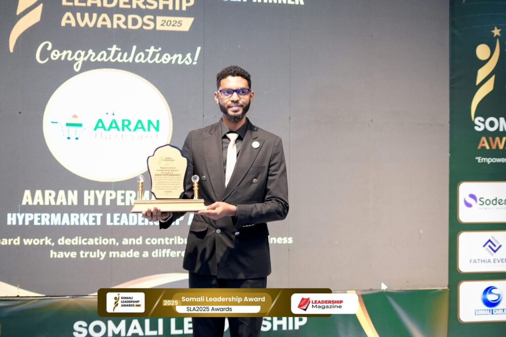 Mogadishu – Aaran Hypermarket has been honored with the Hypermarket Leadership Award at the Somali Leadership Awards, recognizing its outstanding contributions to the retail sector in Somalia. The prestigious event took place in Mogadishu, celebrating leaders and businesses that are making a significant impact in the community.