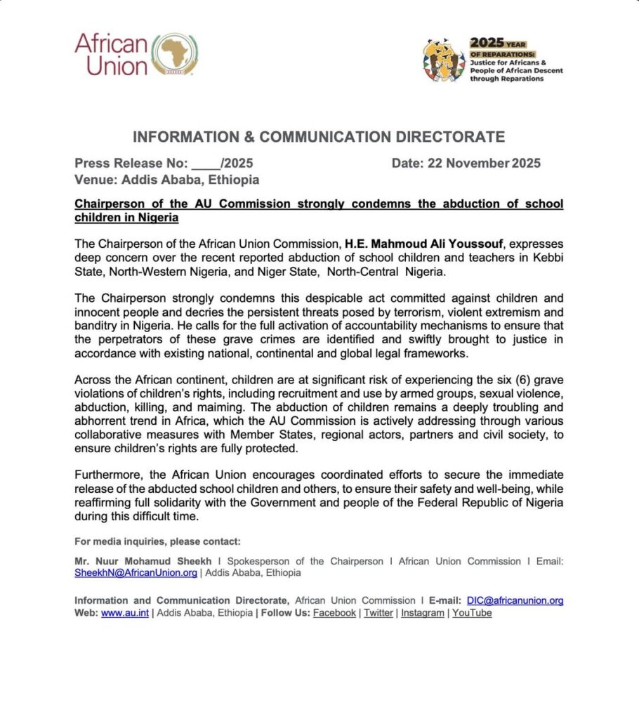Furthermore, the African Union encourages coordinated efforts to secure the immediate release of the abducted school children and others, to ensure their safety and well-being, while reaffirming full solidarity with the Government and people of the Federal Republic of Nigeria during this difficult time.