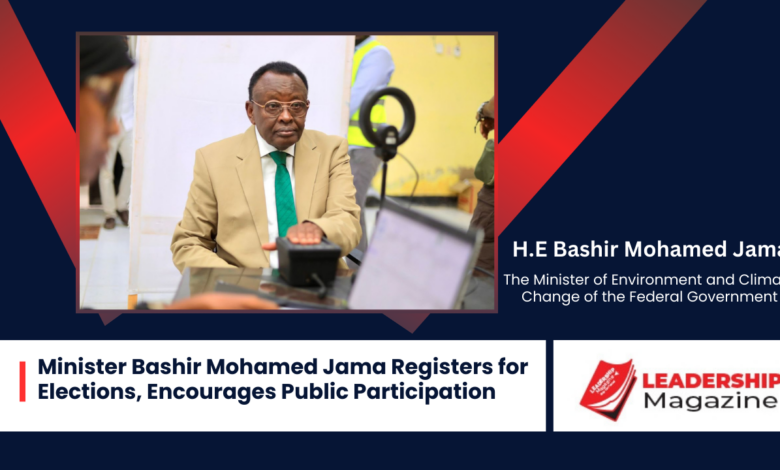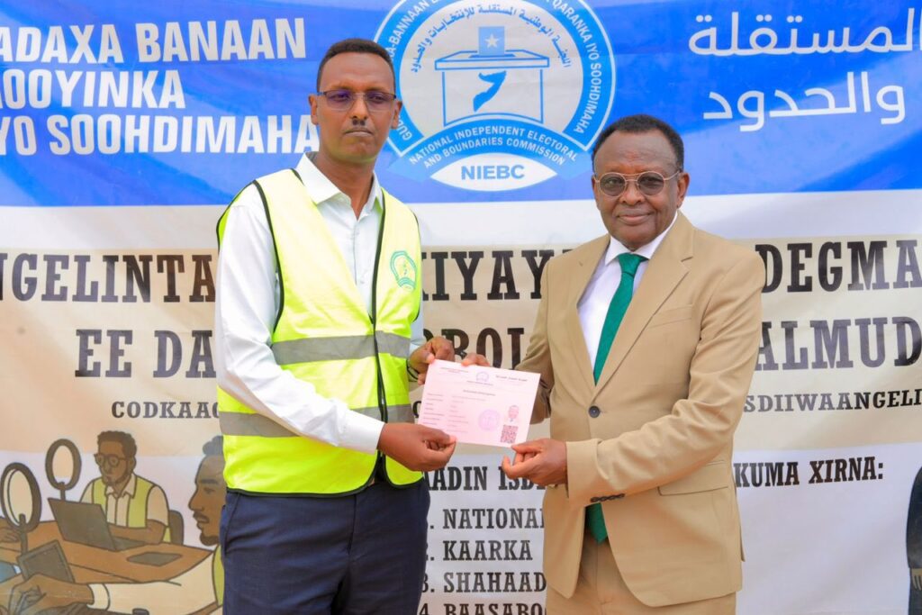 Galkacyo (LM) The Minister of Environment and Climate Change of the Federal Government, Major General Bashir Mohamed Jama, was registered today in Gaalkacyo and received a voter card, his electoral constituency, joining citizens keen to participate in the upcoming national elections. This action underlines a concerted effort to return power to the hands of the people.