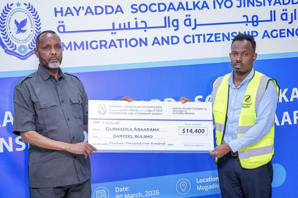 MOGADISHU, March 9 (LM) – Staff of Somalia’s Immigration and Citizenship Agency on Sunday donated $14,400 to support drought relief efforts, handing the funds to a local charity group assisting communities affected by severe water shortages.