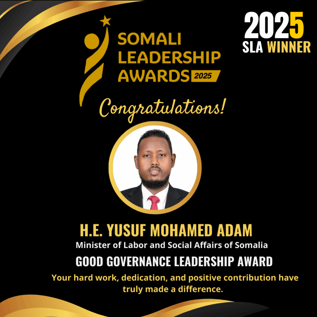 Mogadishu – H.E. Yusuf Mohamed Adan, the Minister of Labor and Social Affairs, has been honored with the Good Governance Leadership Award at the Somali Leadership Awards for his outstanding contributions, dedication, and hard work in promoting social welfare and labor rights in Somalia.